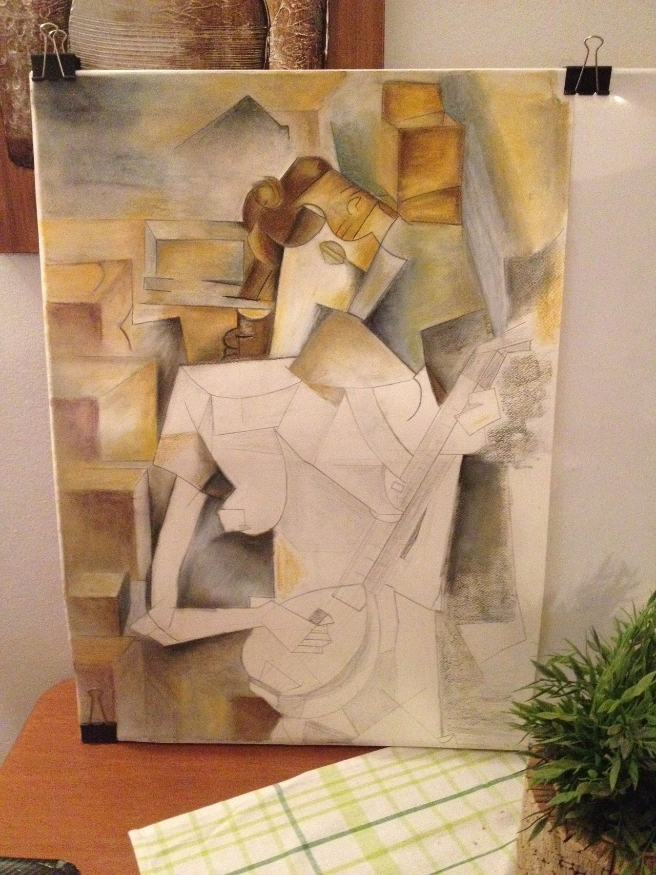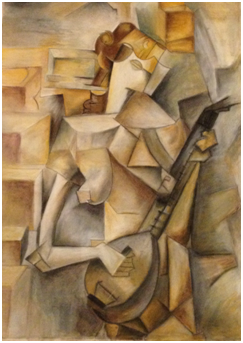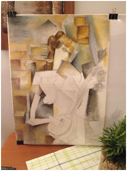 The subject shows a girl plays the guitar. The style of the painting is analytical cubism. As you may notice a numerous of viewpoints, lines, and sides that overlaps are its main characteristics. The color palette is considered to be limited (mainly consisted of grey, brown ochre, yellow ochre, warm green and ultramarine blue) in order to create a unique and earth atmosphere.