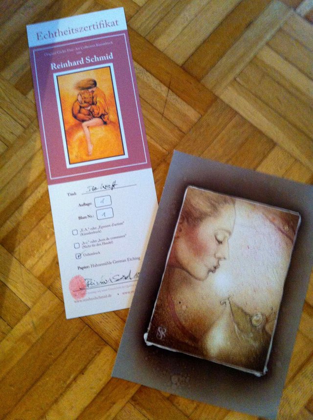Before we had chatted about the conditions, if I wanted to buy the picture including the symbol and characters or if I wanted to buy it without and what size it should be and if it should be mounted on a wooden frame or printed as a reproduction. I choose the printing. "Giclée print on paper" tells me the artist. Well, I don't know anything about it, but it sounds lovely. It became "Hahnemühle German Etching" paper.