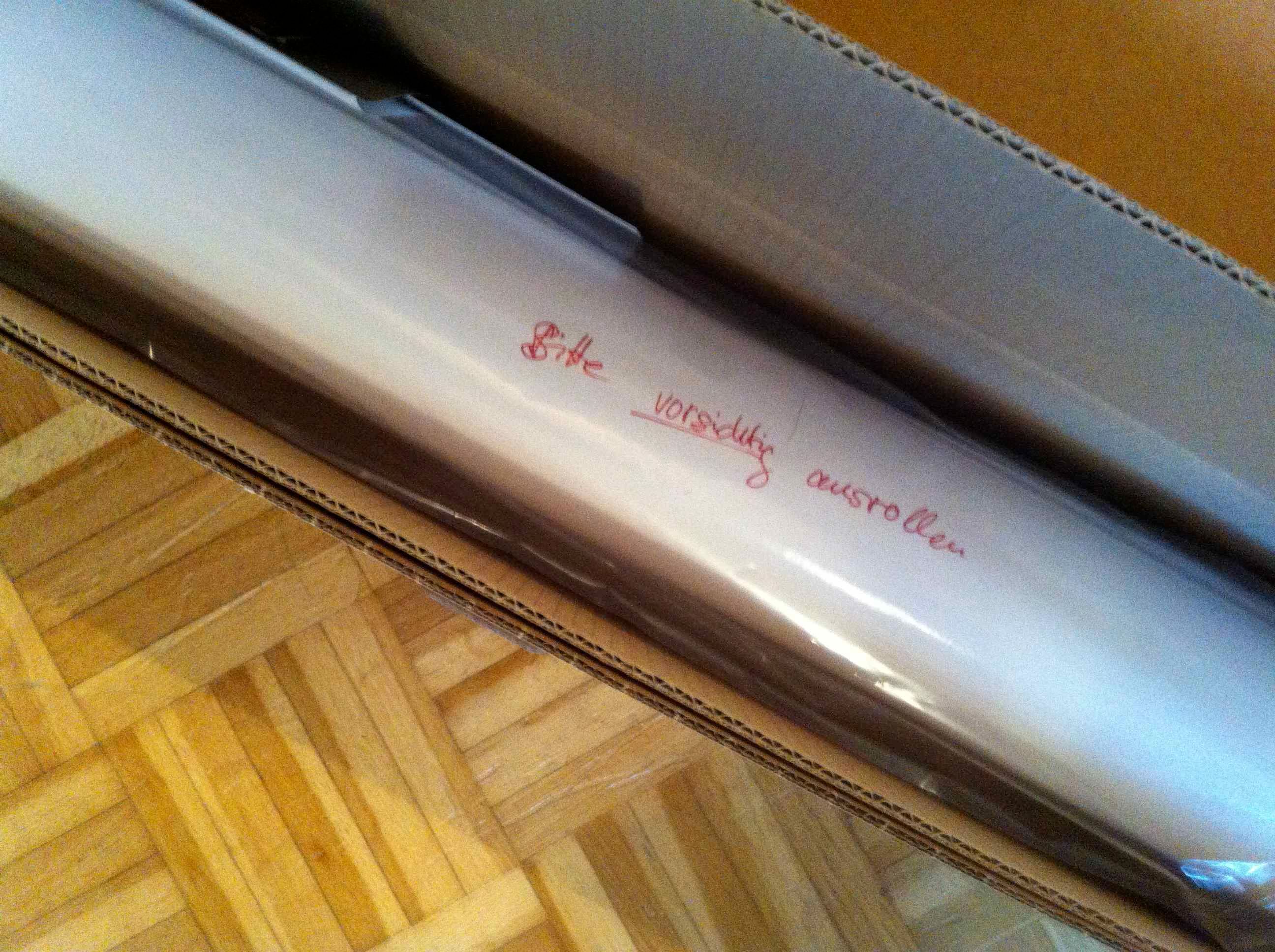 Da man normalerweise eine Glasscheibe vor das Bild setzt, wäre der Versand gerahmt extrem aufwändig gewesen. Ich hatte auch überlegt, das Blatt flach in einer Mappe zu schicken, aber so erschien es mir sicherer.