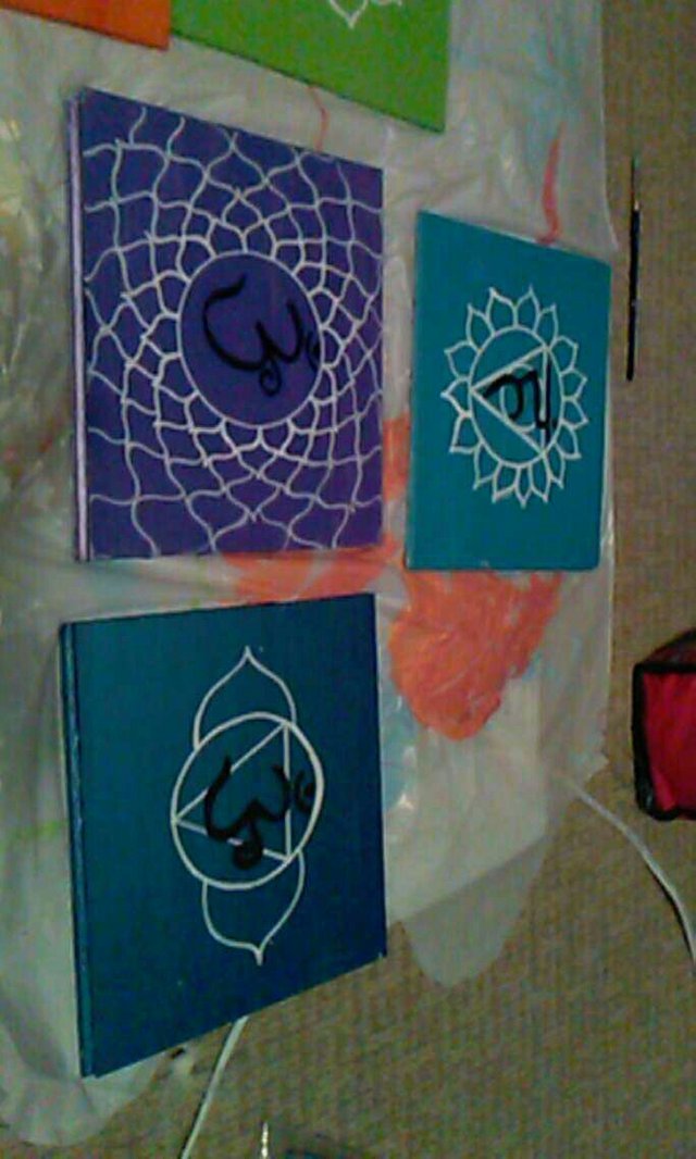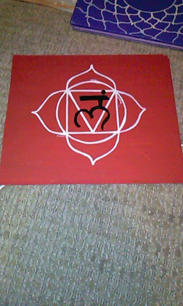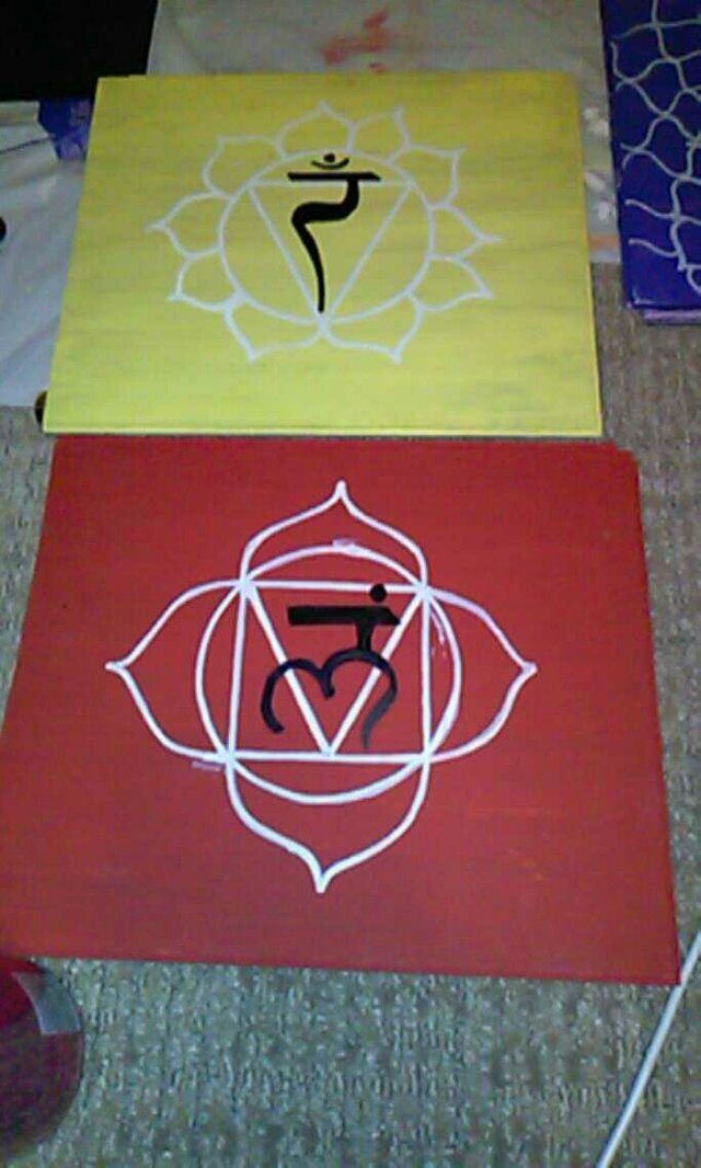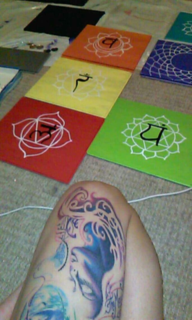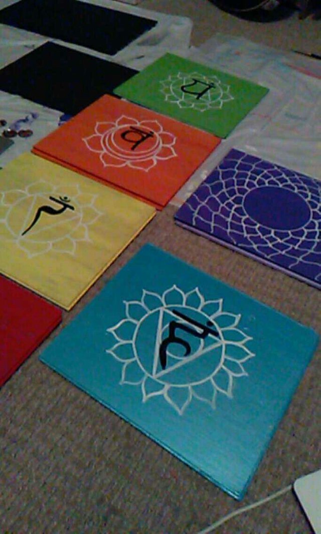 Next, i added in the black symbols in the center of each panel. These are the traditional reiki/ yoga symbols for each chakra.