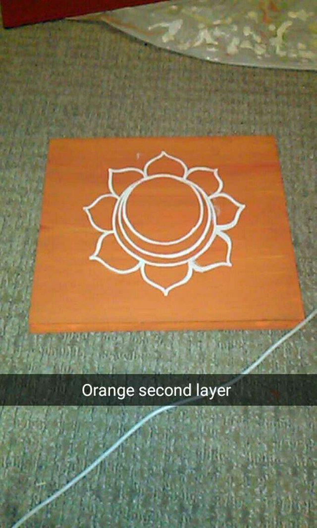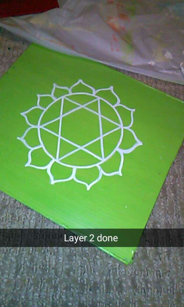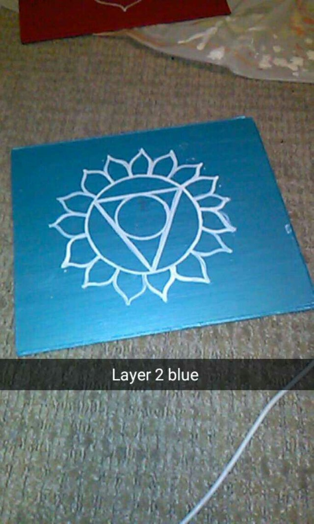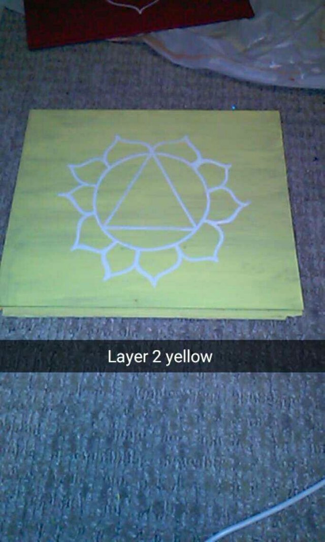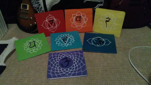 Next, i added in the black symbols in the center of each panel. These are the traditional reiki/ yoga symbols for each chakra.