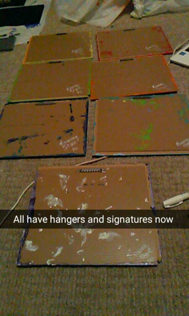 The final step for tonight was to add hanging things on the backs, which i did using a ruler and superglue ( because these panels are so thin, nails are out of the question), and to sign each peice.