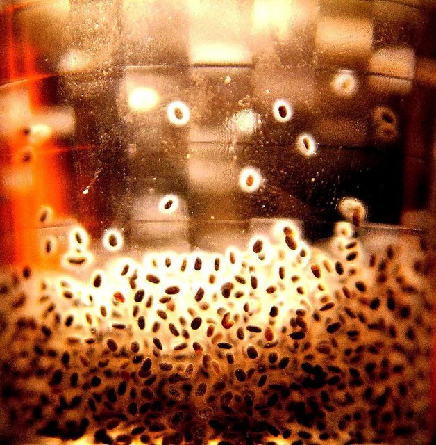 This is a photo I took of my drink with floating chia seeds, inside a faceted glass.