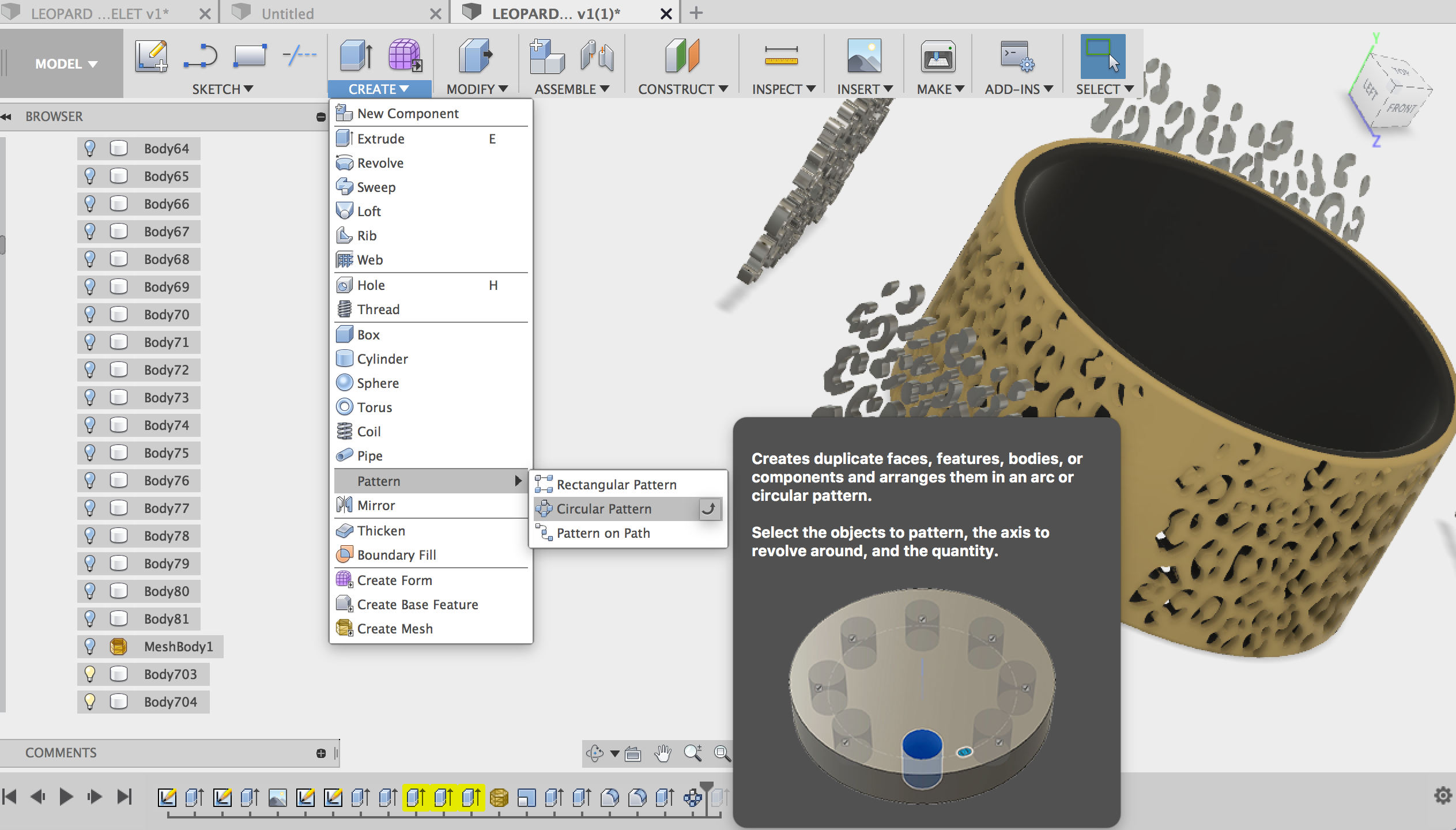I wanted to have 4 times the leopard print pattern on the bracelet, so I created a pattern of it by clicking on Create ? Pattern > Circular pattern. You can choose how many times you want to have the pattern. I thought 4 times would be good enough. Then I extruded the remaining three patterns on the bracelet.