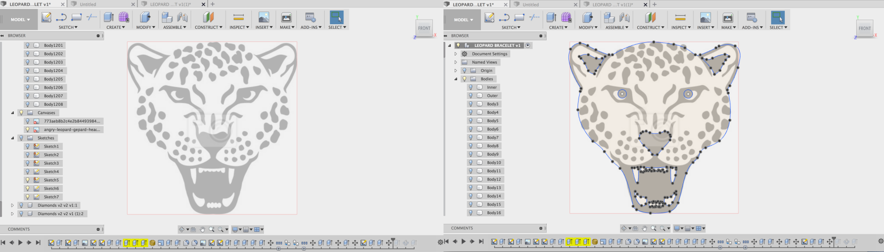 I imported an image, the leopard print and placed it on the face of the bracelet. With Spline I traced the print and extruded the print. There were 79 leopard sort of circles that I traced and extruded.