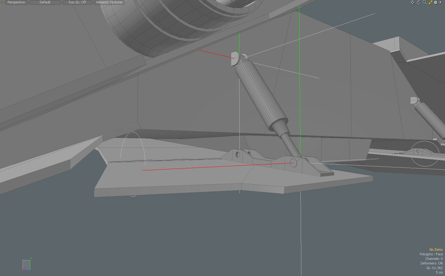In this picture you can see locators: the two red / green / white crosshairs. The white circle is a rotation controller for the flap. Each locator has its double in exactly the same position. One is pinned to the anchor point at the back of the ship, its twin is anchored to the top of the piston. Another is anchored to the bottom of the piston, its twin to the flap.