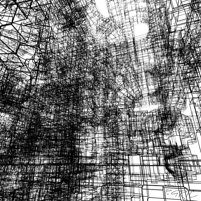 I used this geometry in 2004 as the basis for my painting Metropolis. While I always use solid-rendered models as references for my paintings, I love the aesthetics and density of the underlying wire-frames. In order to get a greater sense of space in this short GIF-animation I added some "thickness" to the mesh.