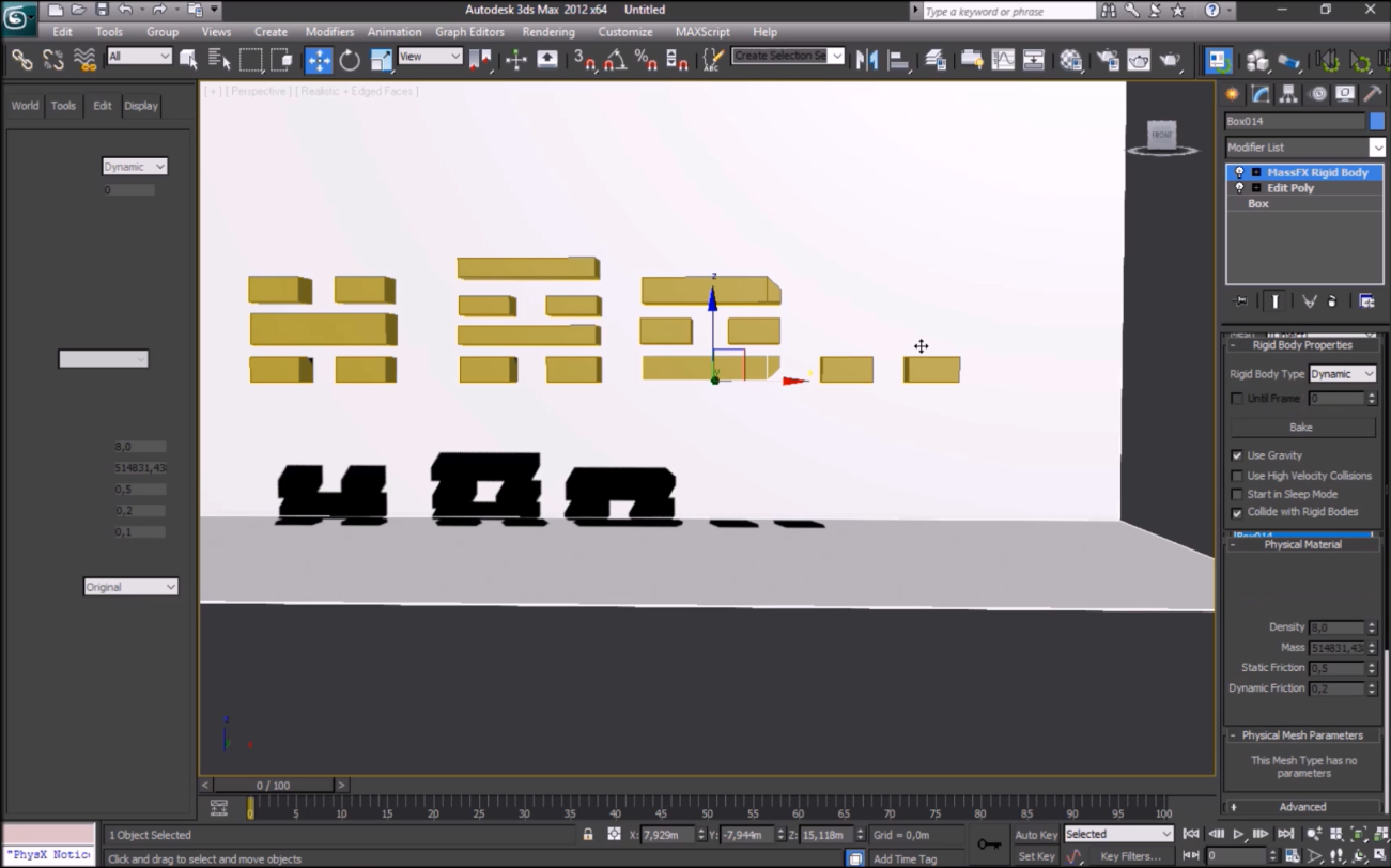 Now selecting our platform and back wall, we go to the second button of the bar MassFX and select Static (This because these objects will not move in the scene), now having selected all our letters we place them as Dynamic, with this option will be pushed or pulled by any force that exists in the scene, in this case it will be gravity. Now we can give the "Play" button of the MassFX bar and we will see the animation of our scene.