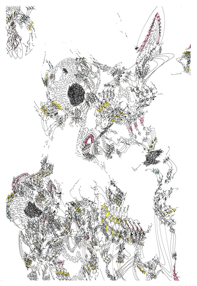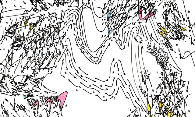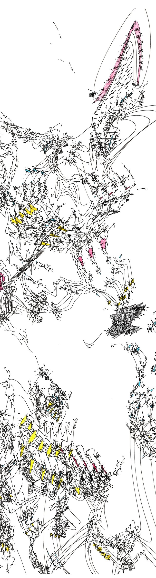 In this drawing, Michael builds a narrative of organic, flowing linework. Clusters of arrows playfully gravitate and orbit one another. In each of these hand drawings we’ve incorporate a new color palette of cyan, magenta, yellow and black (or CMYK.) In this composition, colors are used to highlight hidden forms and breaks in pattern.