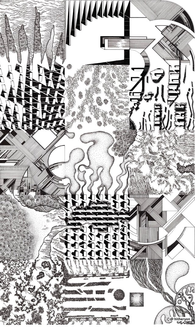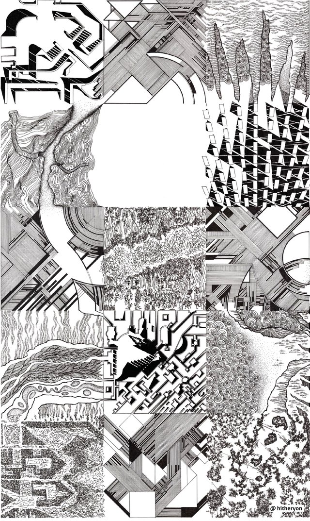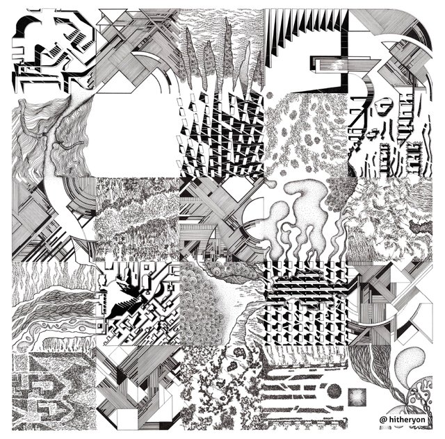 Beginning with a blank sheet of paper, the drawing incorporates an equal proportion of space from four artists. In this exercise, the 70cm square sheet was divided into a pencil grid of 12 x 12cm squares. Using the methodology of an architect approaching an empty plot of land, we filled in an equal area of blank space and once complete we rotated positions. The process was repeated 6 times around, as we continuously developed our image of each drawing, playing off of other's unique styles and ideas. As time went on and the drawing evolved, we found ourselves adjusting our individual narratives in order to cooperate with one another's creations.