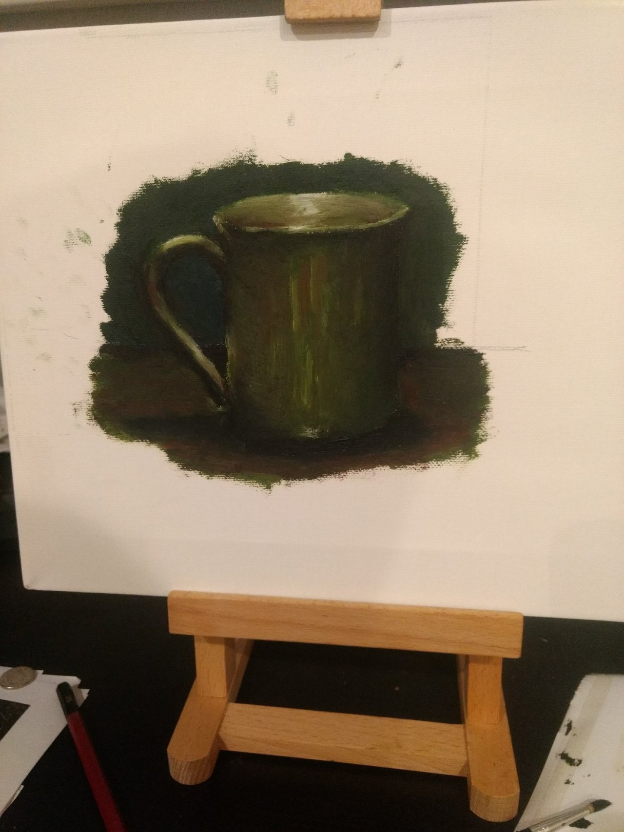 The good thing about oils is that they take longer to dry compared to acrylics. You can place a color and blend it nicely with other tones behind or around it. At this point I blended the colors a little and created a texture on the mug.