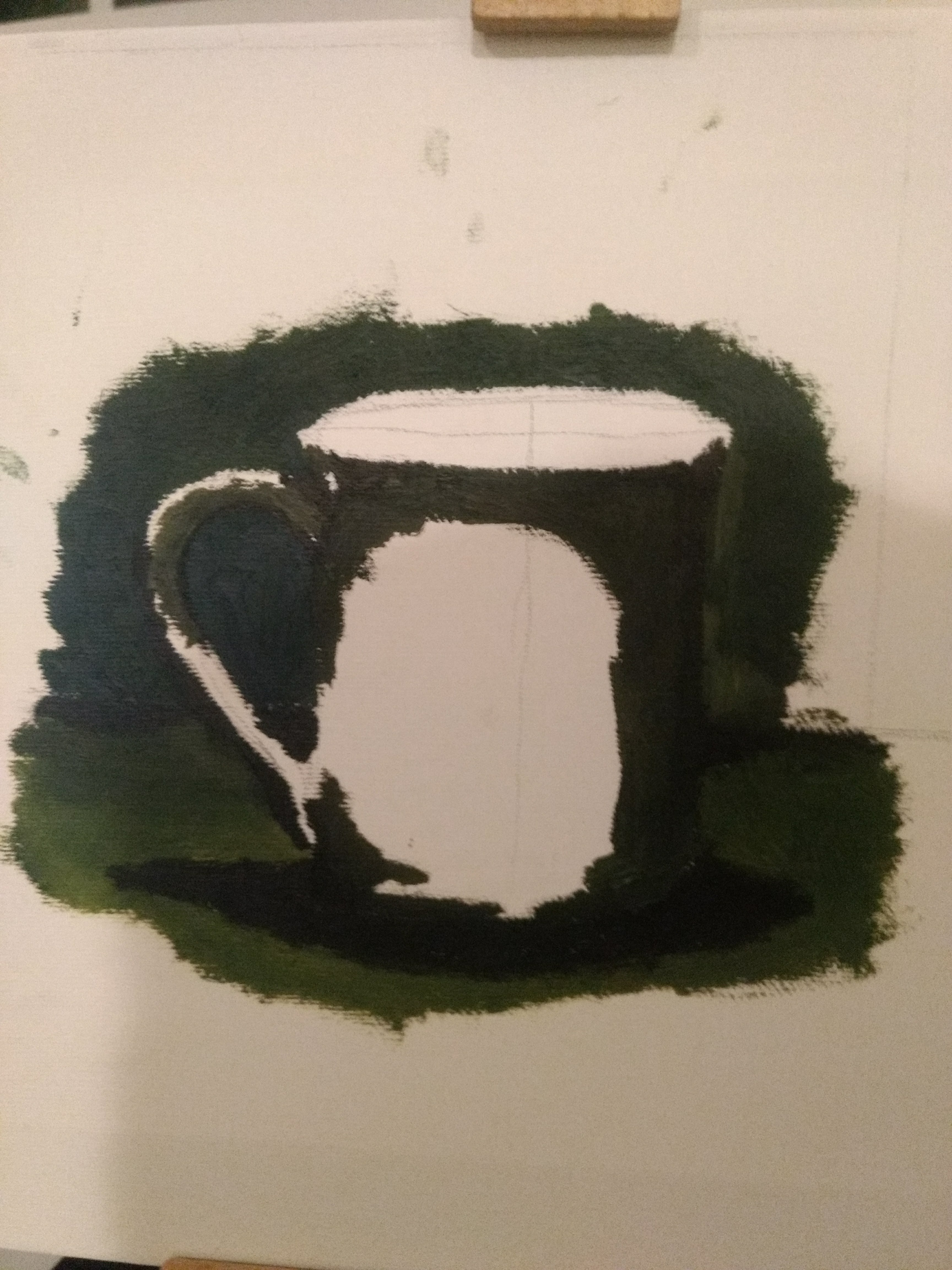 Simple pencil outline for the mug. You want to get your background color in around the object. I went for a dark and slightly lighter green here. This allows you to get the right values and tones in your main focal object as you are comparing them to surrounding colors and not the white background.