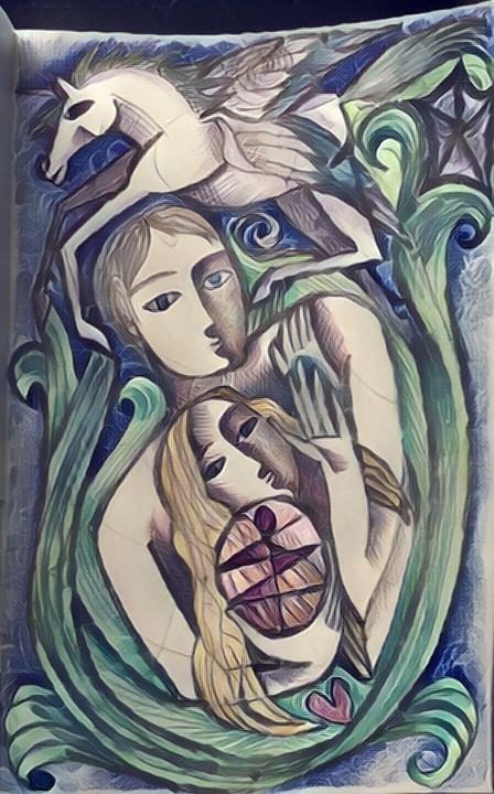 ...The winged unicorn means his connection to the unconscious- and it is flying left to right- from the unconscious to the conscious...Manifesting from the unconscious...