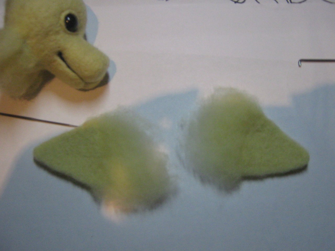 Let's get to the ears. We take the wool, divide into two identical pieces. Fold them in the form of triangles and lay with the needle number 38 on both sides alternately, we attach.