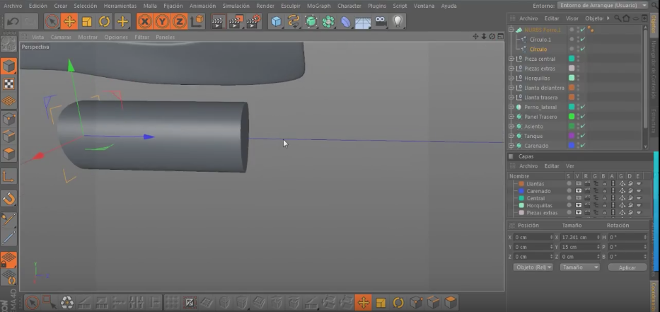 To finish, we designed the lower tube, which connects the exhaust pipe with the engine, we will use a cubic spline to then use the technique of "travel" which is nothing more than creating 2 splines, one will define the width and the other will define your travel:
