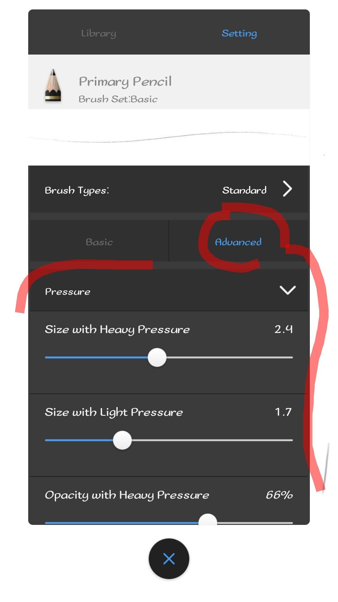 On the other part of the brush set is the settings,each brushes has its own specific settings ranging from size to opacity which are just on the basic settings and advanced settings which under it we can see the pressure of the brush ink,stamp,nib and randomness,