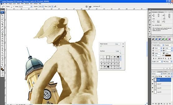 Hermes has curly hair so I painted it with Hard Round Brush 5 px and set brush opacity to 70%. I chose different brown tones for hair. Another detail that I added is the clock of city Rijeka. I extracted it from one photo and put in Hermes hand using Transformation tool.