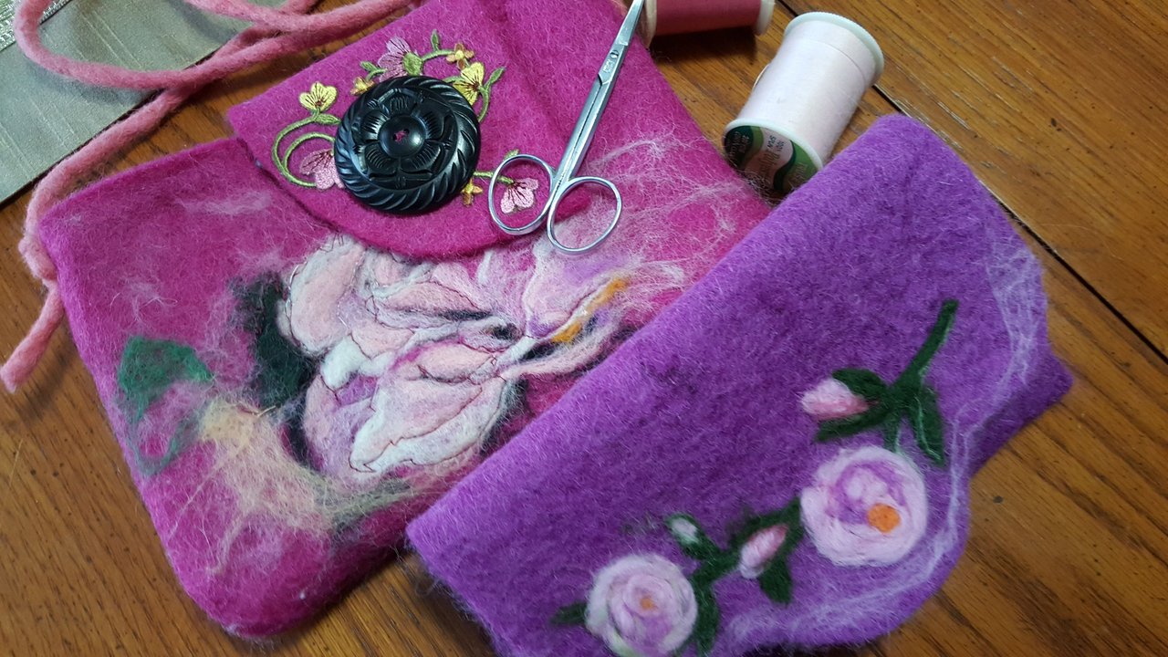 This morning I finished up two practical use items - a clutch and a glasses/phone case. Both are made from felt and in the case of the clutch, the lining is polyester. The designs on the felt bases are needle felted. I finished both by sewing in a lining and adding on a felted strap and securing the seams on both.