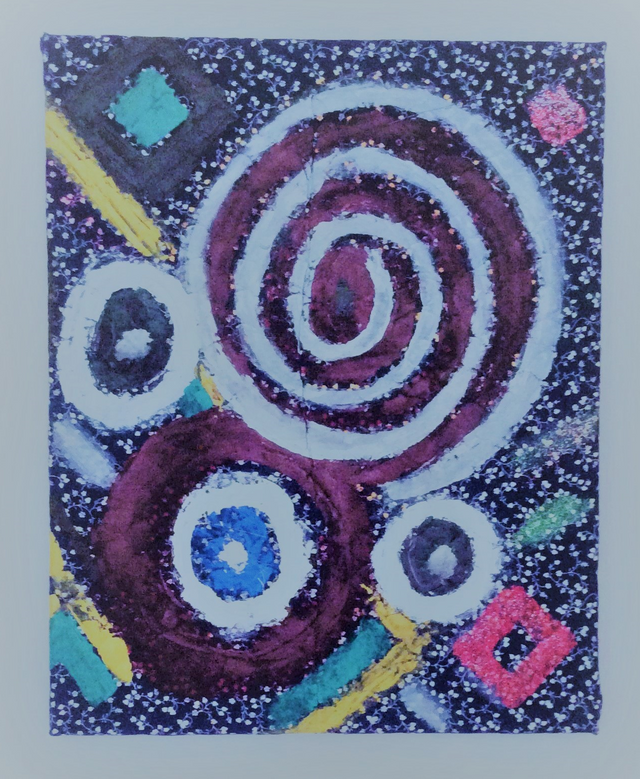 Background is classic quilting fabric installed on the frame with mix of fabric paints and metallic paints. I created two each different size to spread out on different or same wall to create quiet mood in the room with lively atmosphere.