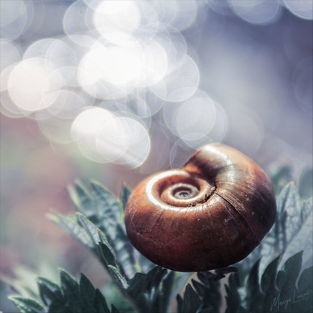 A small shell on the leaves of the nettle. Fragile and graceful sunlight. Moment of magic.