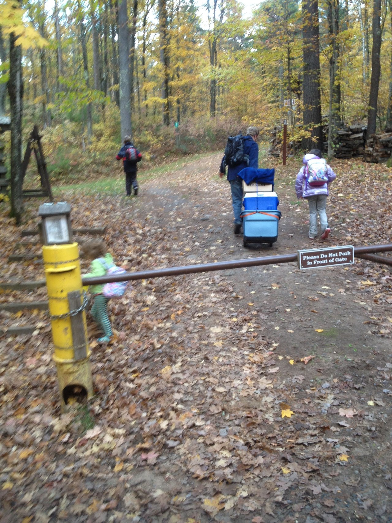 There was a parking spot available at the base of the hill where the yurt resided. We had hoped to get there by mid-afternoon, so we'd have time to haul our camping gear, food and bedding up the 1/3 mile trail before dark and have supper ready for the kids at the usual time.