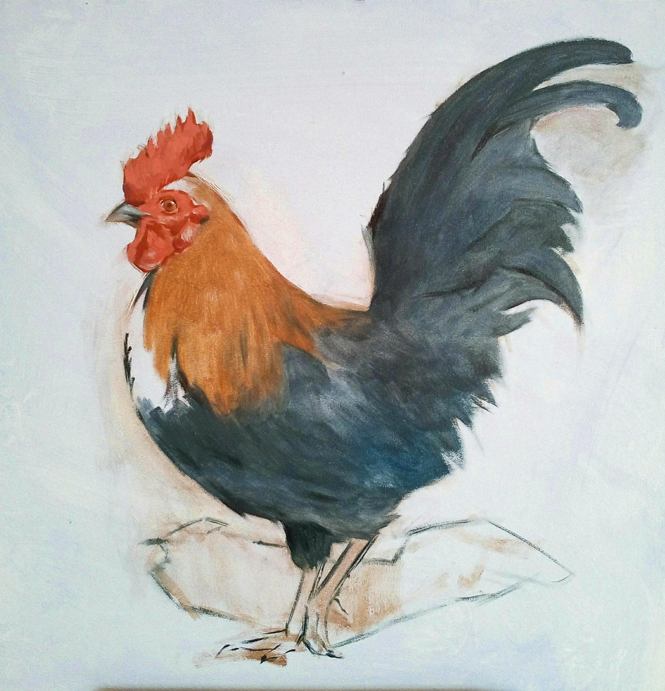 I add in the feet and shadow under the cock to ground my model. As far as the background goes I will keep it light and exclude all the stuff that goes on in the backround of my photo. To me all this things are just distractions and will not add to my painting.