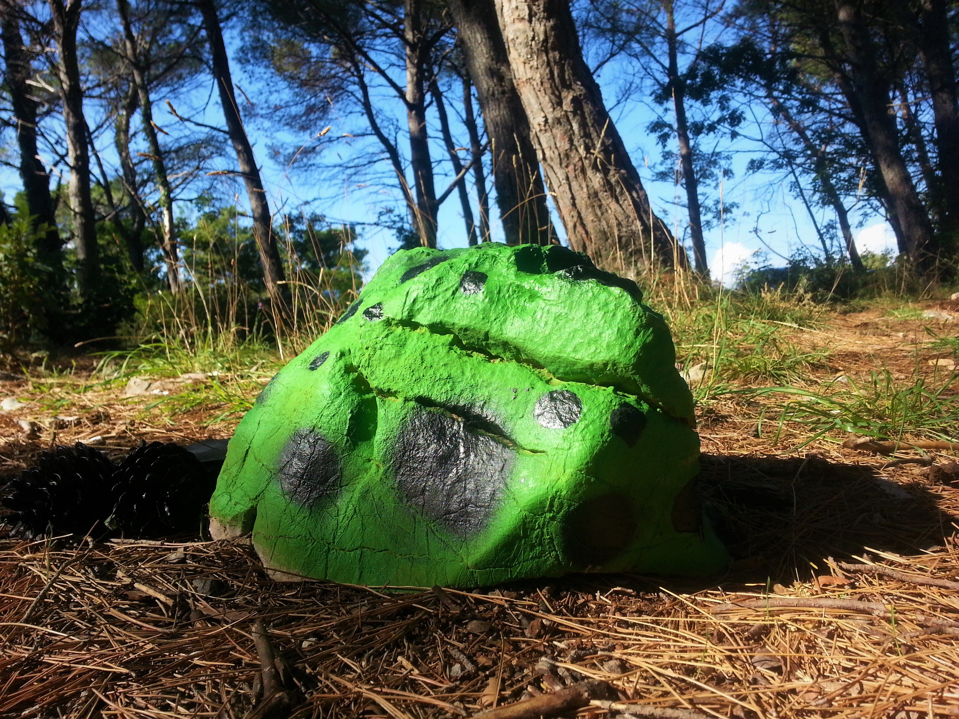 Somebody was creative... He (or she) painted it and then brought it there to greet the people who pass by. And it does the job well :) We smiled when we saw it laying there on the floor in the middle of this forest...