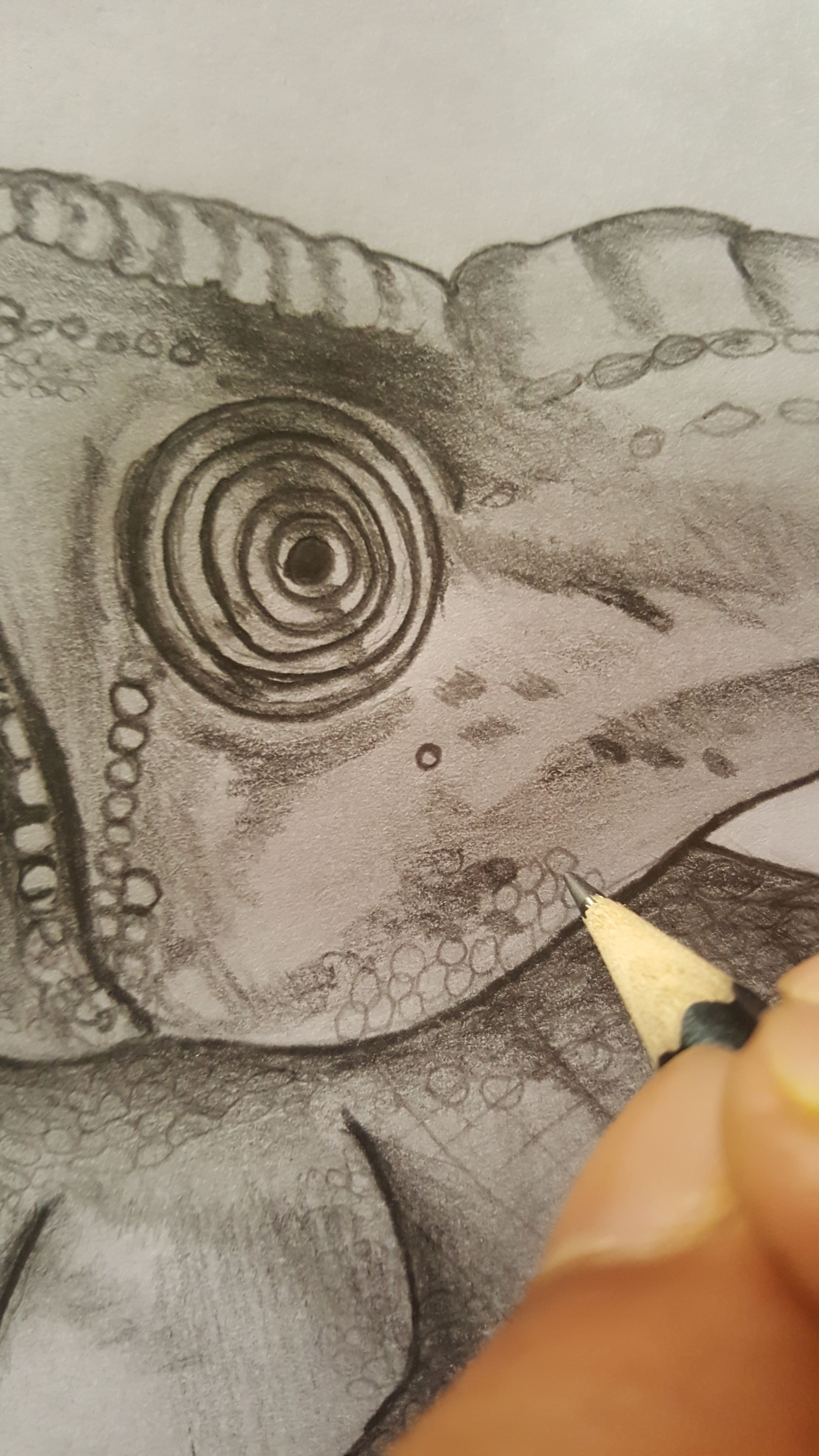 This weird looking pattern is the head . yup, head is the first thing I drew when I started to draw the chameleon. I drew the hole pattern with HB pencil. I drew it so lightly so that I can erase any mistaken part to change the shape.