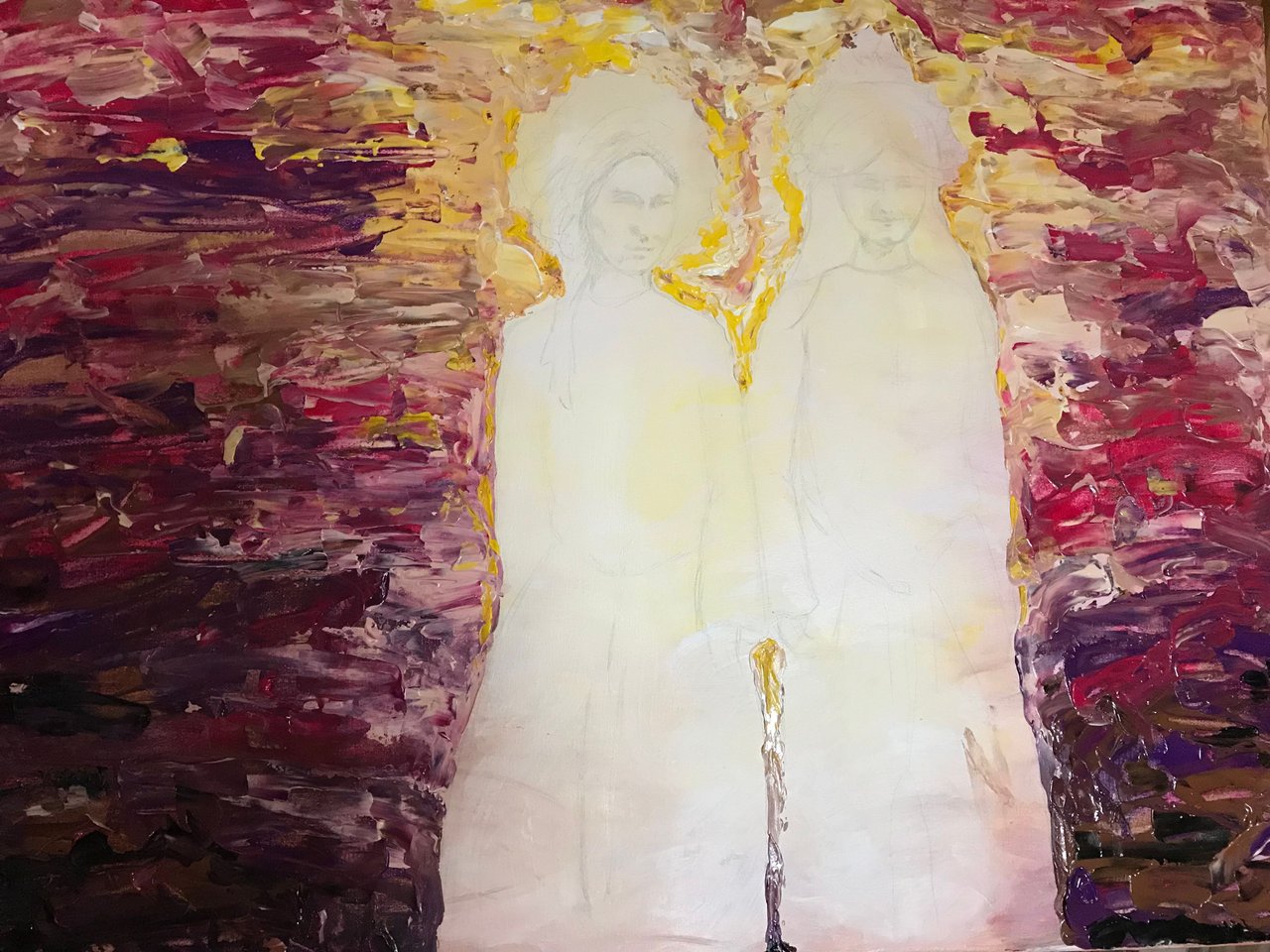Primarily I had to accept, that I cannot be as analytical with my own work, as I would be with someone others, because I know the idea and process behind the painting. But nevertheless, there are ways to get a fresh start with your own work. It may sound simple, but for me it’s working: flip the painting upside down. Mostly my first reaction of like or dislike are a good indicator if the painting is working. The upside-down painting reveals easier if colours are working together, if there is a focal point, if the feelings I wanted to inspire can be noticed, if the perspective is working and so on.