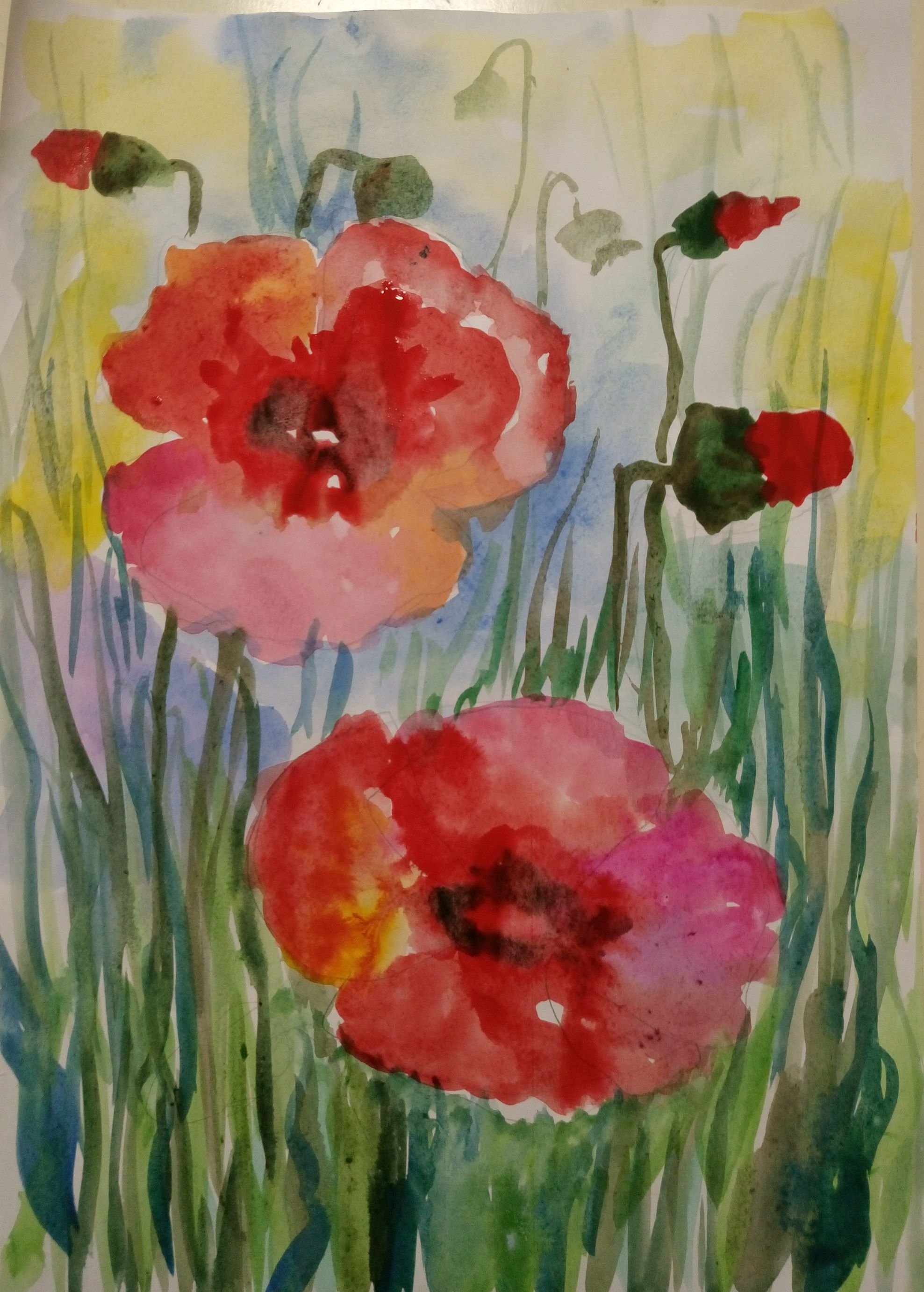 When we painted the petals, then we moisten the middle of the flower and add there the black paint and the green center.