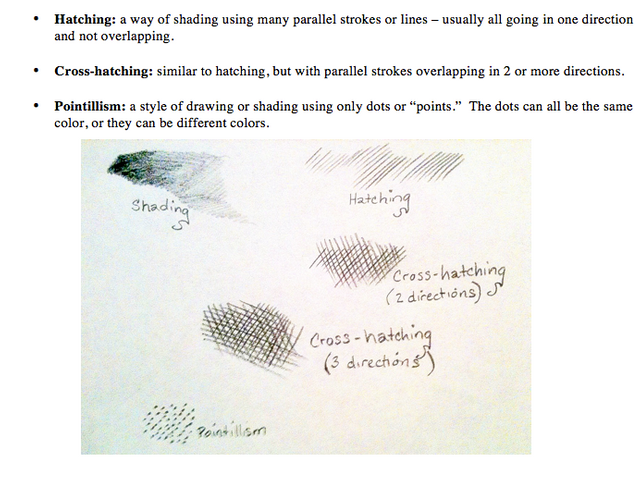 Here are a couple images from my old lesson plans on hatching, Cross-hatching & Pointillism: