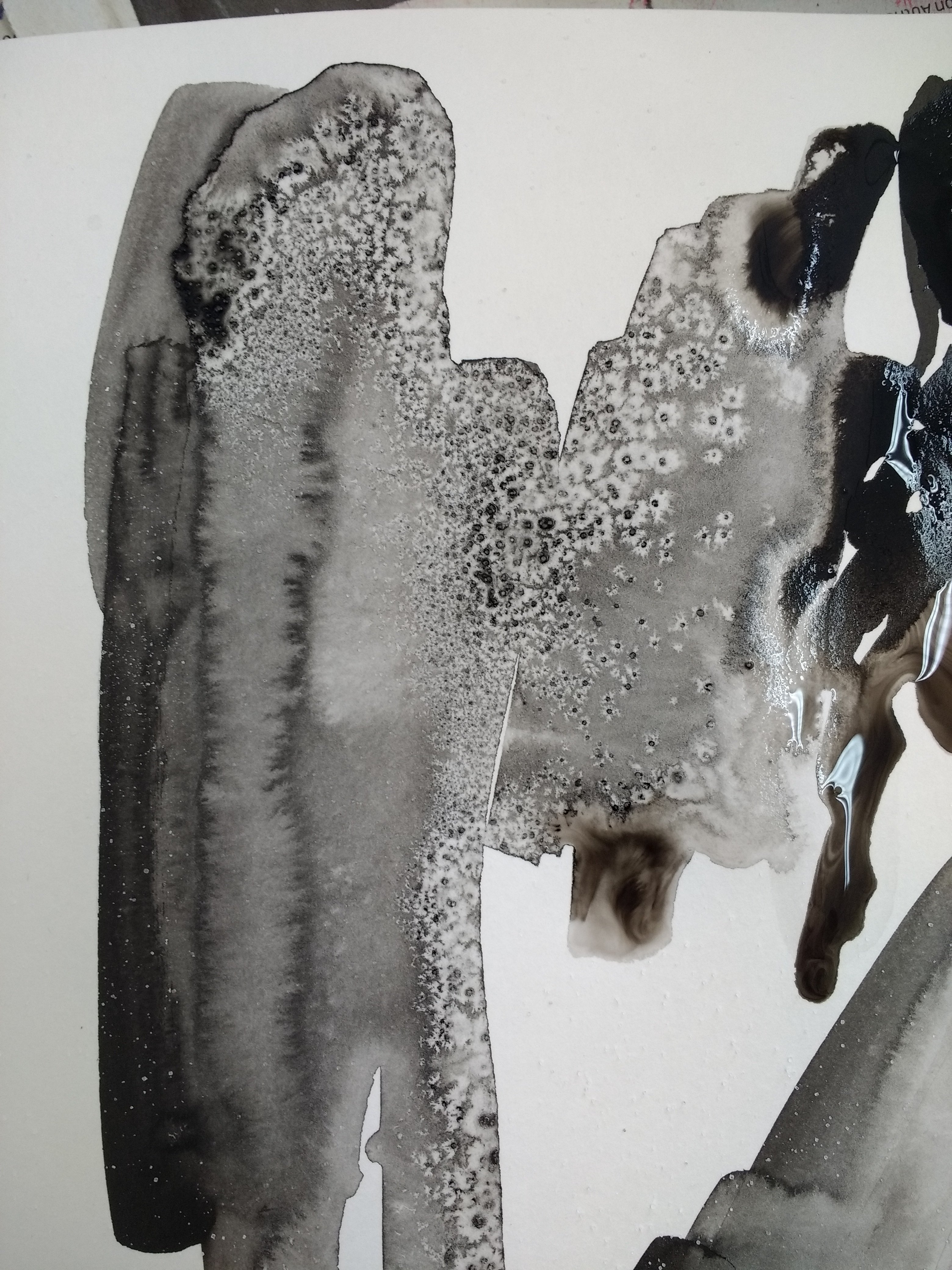 Exploring texture and possibilities using salt and black ink. An interesting experiment sprinkling salt crystals into wet ink to create a grain effect.