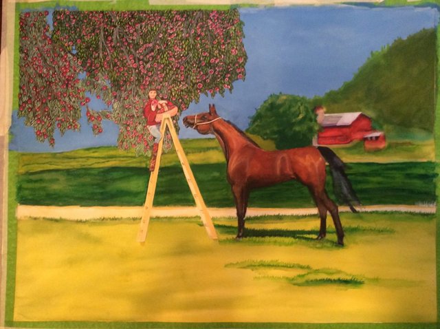 The grass the horse is standing on will be a lot greener when I finish. Maybe I will make the grass look like clouds, I keep seeing clouds in my imagination.