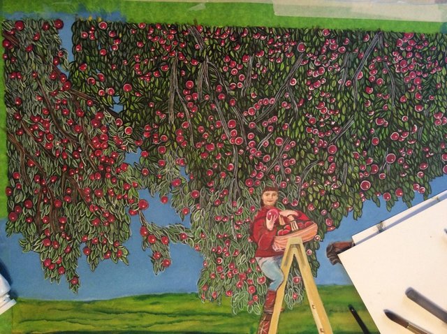 I outlined the leaves and apples in lighter green or red for the apples and white gouache and will go back through to add a bit of shadow around the base of the leaves.