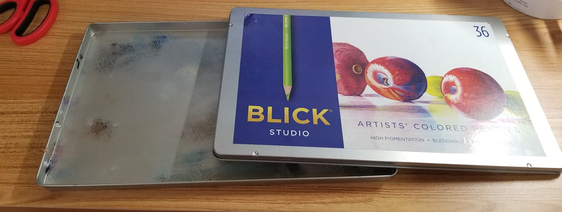 Here I have an old colored pencil tin. You don't have to use a tin, you can use whatever you want. You can use a glass plate, a plate covered in tin foil, a plastic Tupperware container, whatever can hold water. The nice thing about a tin, or something with a lid, is that you can put a lid on. If you have a lid your paints can stay wet for a few days. One time I had left paints sit for almost a week and they were still ready to use.