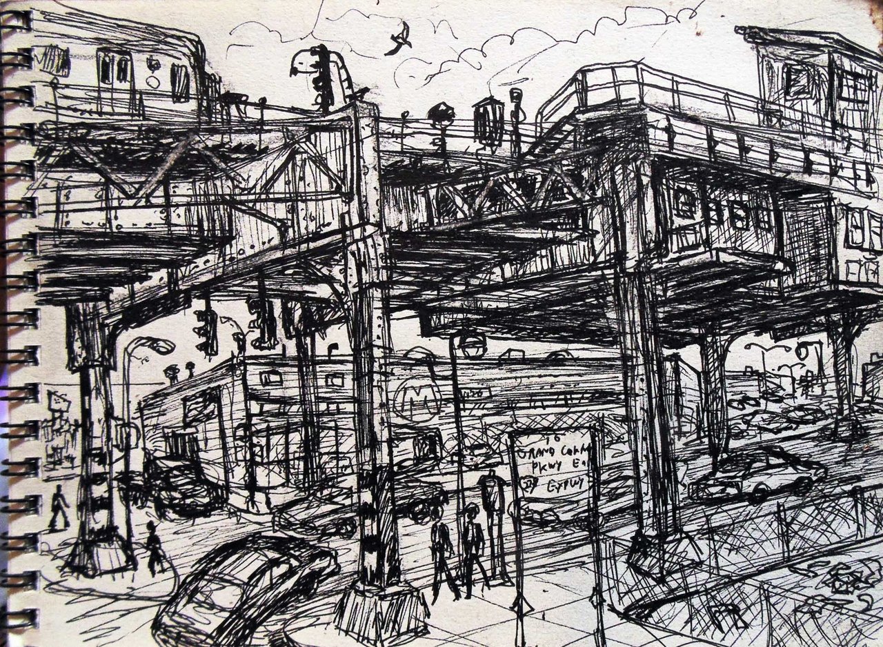 TRAIN JUNCTION IN QUEENS. Arthur Robins. 6 x 8. Pen and Ink on Paper. While living in Queens NYC, i kept getting tickets because my van had no backseat. I took them out because i didn’t want them. Why i had to have one was a mystery. So one day i went to a junk yard to get one that i could lift in and easily. While there, I saw this strange junction for the 7 train. I drew it with great pleasure and interest.
