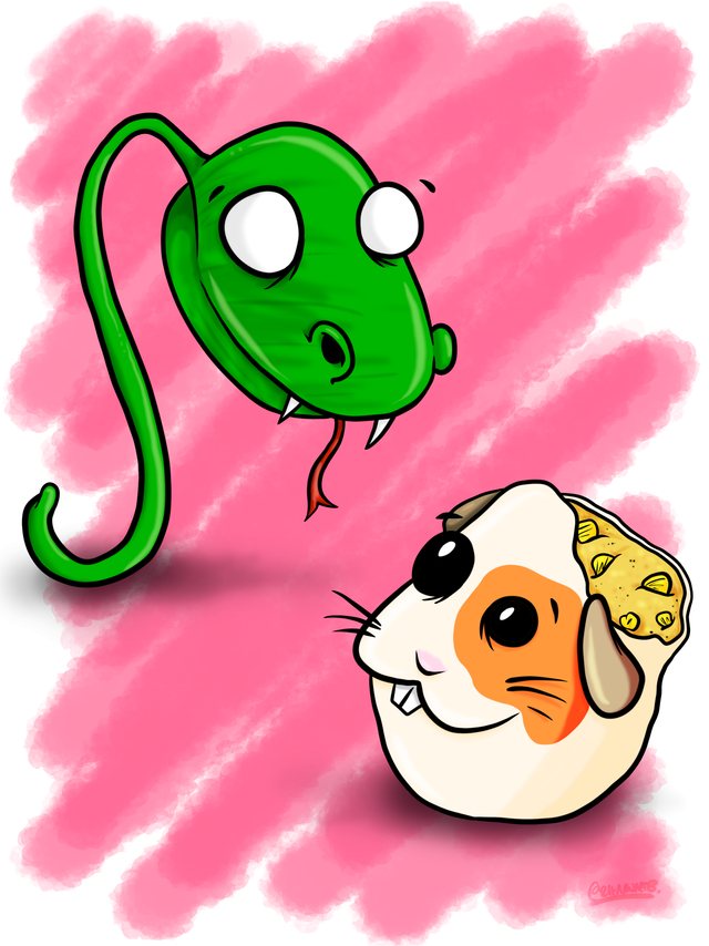 The idea of Holi-Art is to create a piece of art with a theme that is based around each day's less popular or even funny national or international holidays. Today is July 16th and thanks to the website www.daysoftheyear.com, I have learned that it is Guinea Pig Appreciation Day, Corn Fritters Day, Get Out of the Doghouse Day, World Snake Day and Fresh Spinach Day. So today I will post an original piece of artwork that corresponds with one or more of these particular 'holidays'.