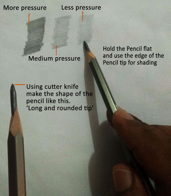 Before we start shading, we have to tune the pencils. For shading use the long and rounded tip of the graphite pencil. Shading is all about pressure and create few swatches with different pressure to get the desired tone for your drawing