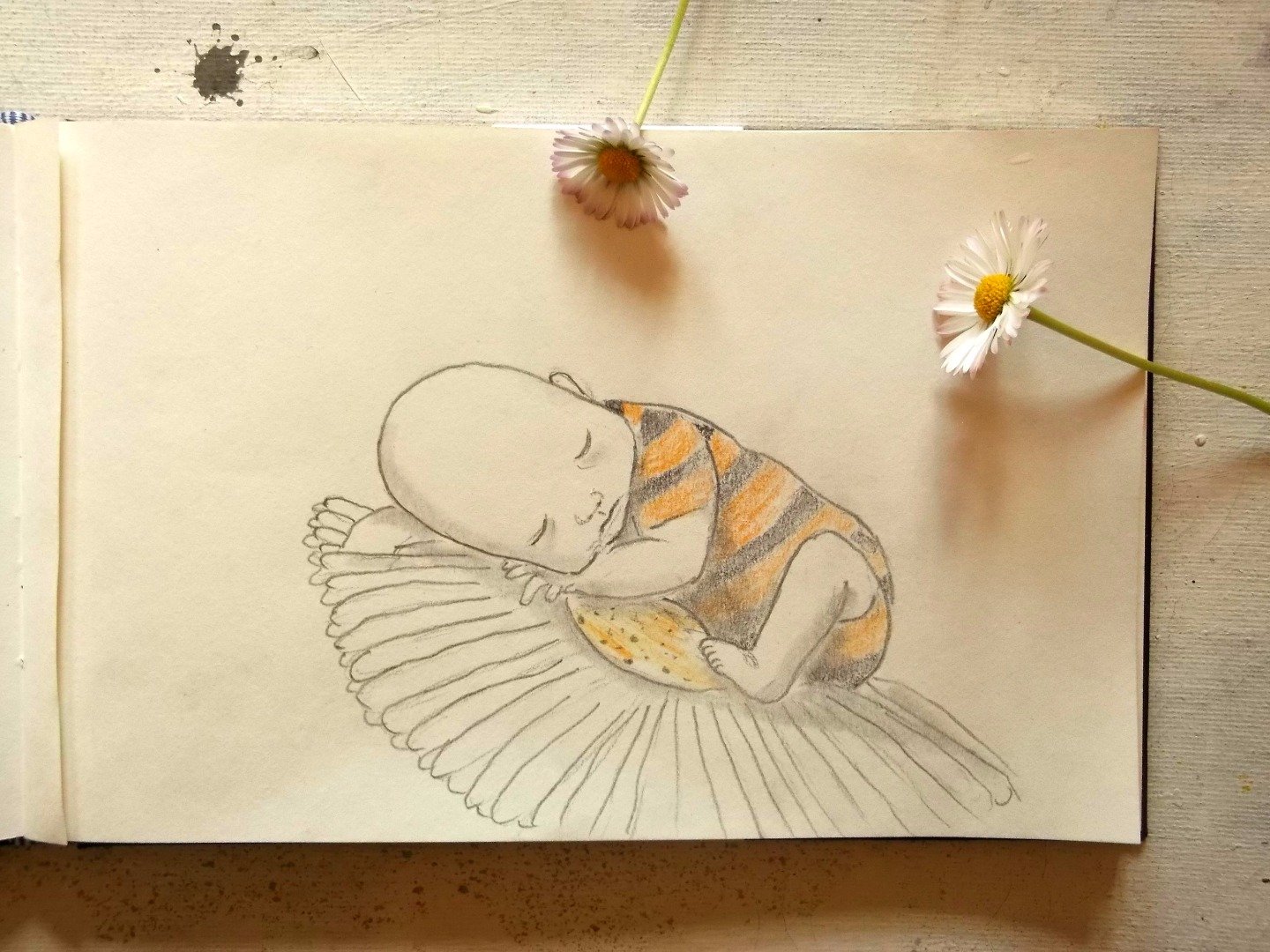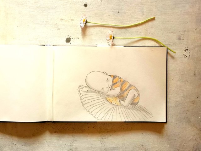 In the morning, I sketched this new born baby who are sleeping on a comfortable and cozy daisy, I think it's the right sketch to represent this Sunday.