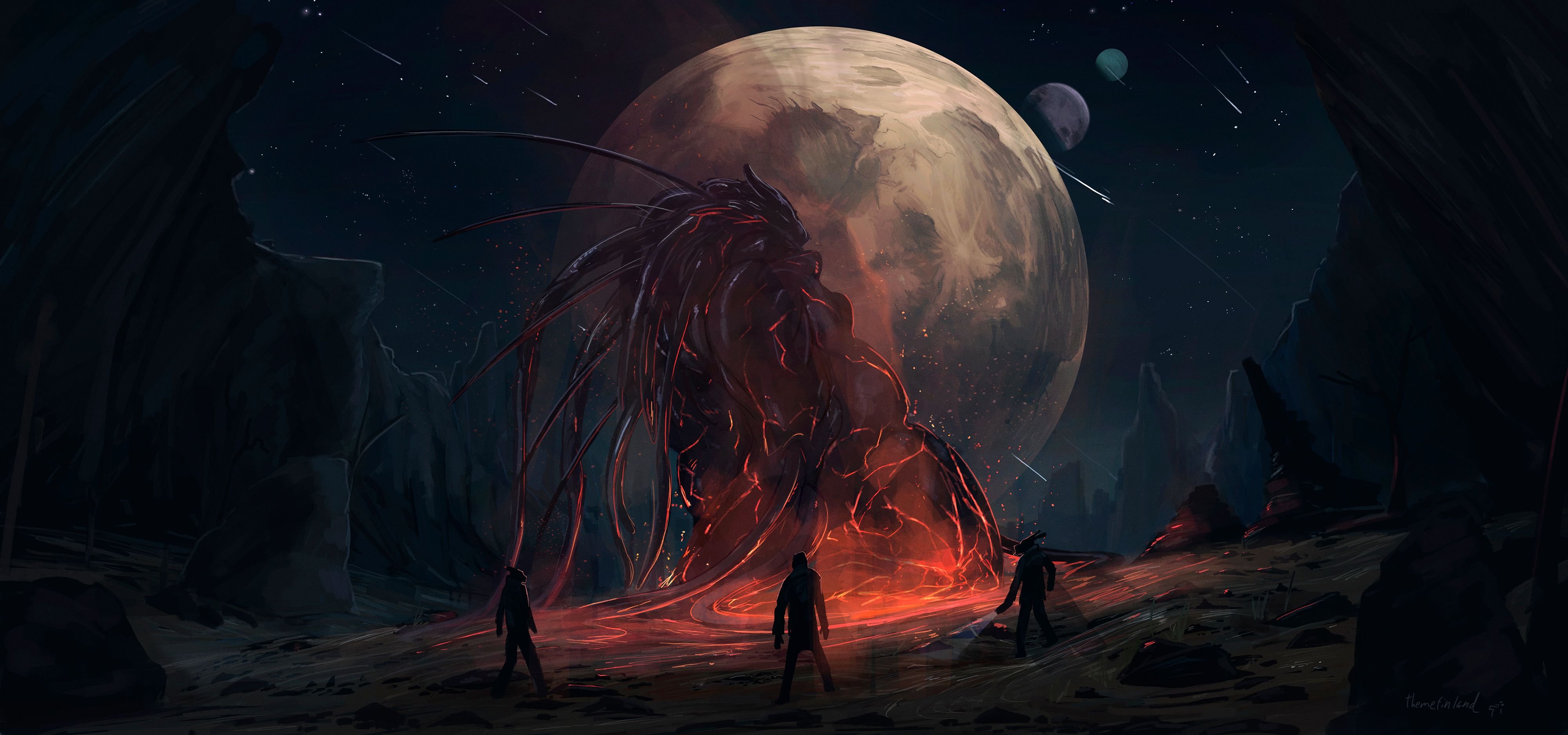 Hundreds of years into the future after this tale is written an incredibly rare astrological phenomenon is happening. The moon and two nearby planets will eclipse each other. This event is to be said to be accompanied by a glorious meteor shower, something which a small group has gone to the desert to admire, away from any light pollution. Shortly after the eclipse has happened they hear a deafening crash from a small canyon nearby. They can barely believe their eyes when they get to the source of the crash. A large unidentifiable...something stood before them, smoldering. It did not look like an ordinary meteorite, but it did not seem like a satellite either. Baffled and confused they stared at the thing from a safe distance while the little hours of the night passed and the thing stopped burning.