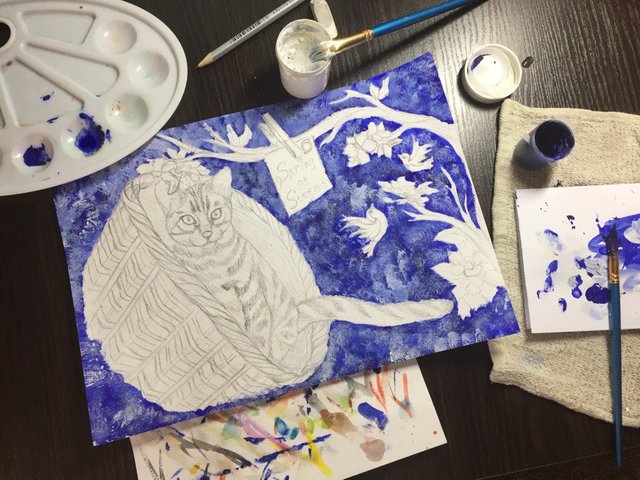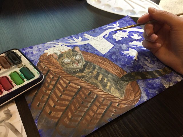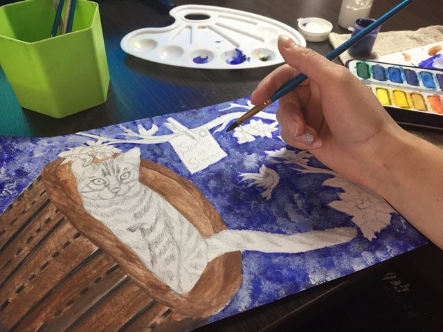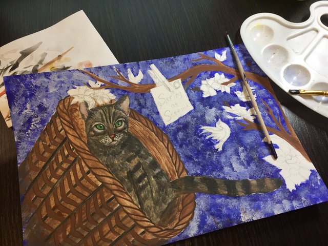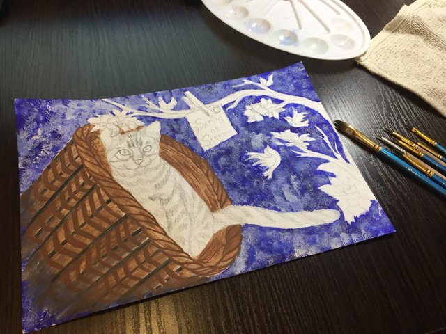 At this stage I have already painted the background and orzinu. For the background, I used colors: blue and white. I dyed the basket into brown and added a black outline. Well, as you can see in the picture.