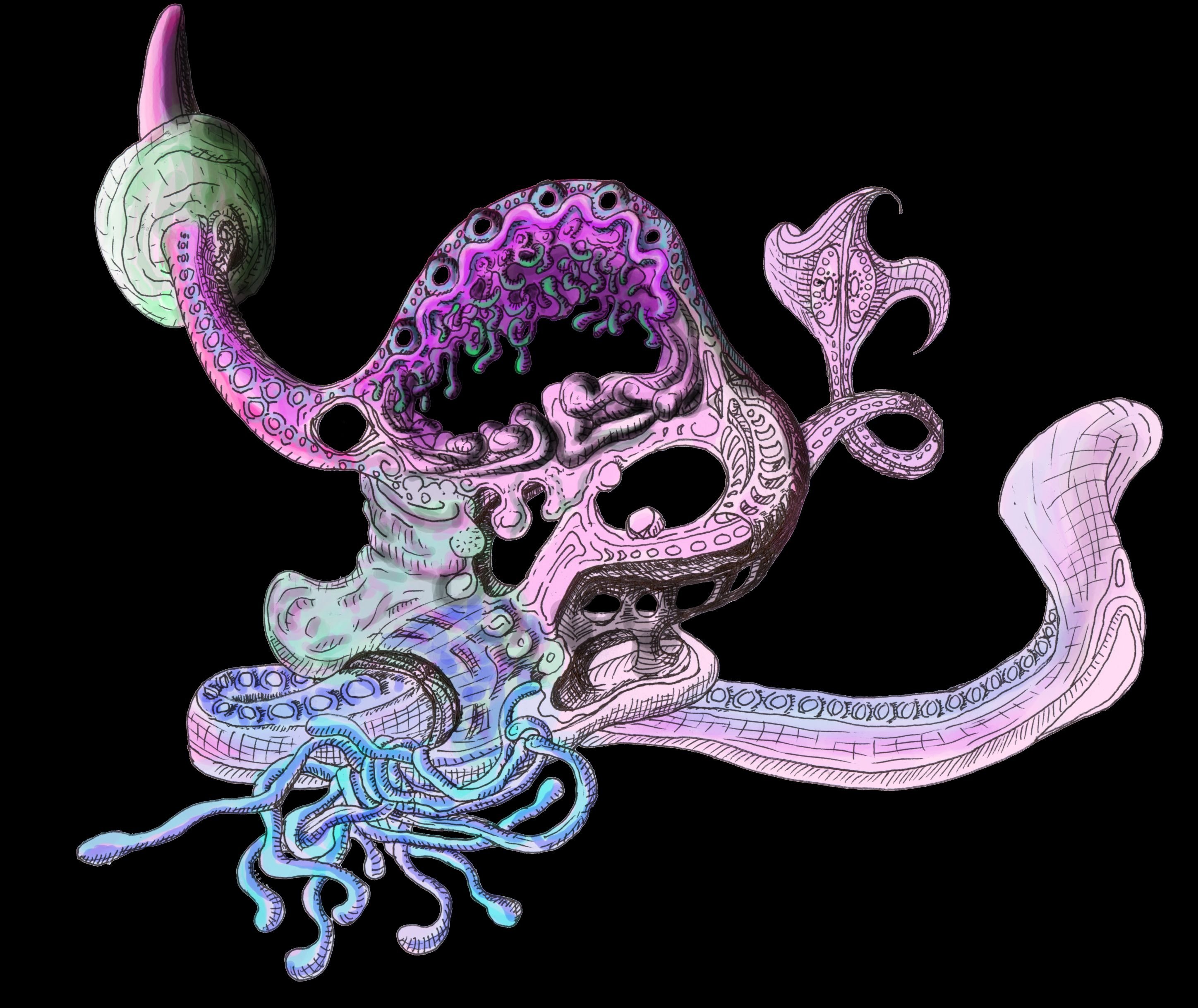 First let's talk about the elephants in the room. I get a lot of questions about what seem to be phallic and vulvic elements in my art. So yes, that is an alien organism penis-equivalent and vulva-equivalent sticking out to the upper left and lower right respectively. This is an alien hermaphroditic sexually reproducing organism. And also, tentacles. This is what I consider beautiful, so deal with it :)