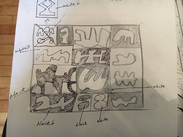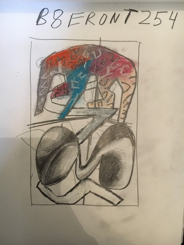 B8ERONT45, thats the name of it. just as abstract as the process. It just came to me. A large patterned flat shape on top, A shaded shape on the bottom half, and a THICK LINE shape that goes up through them and behind them.