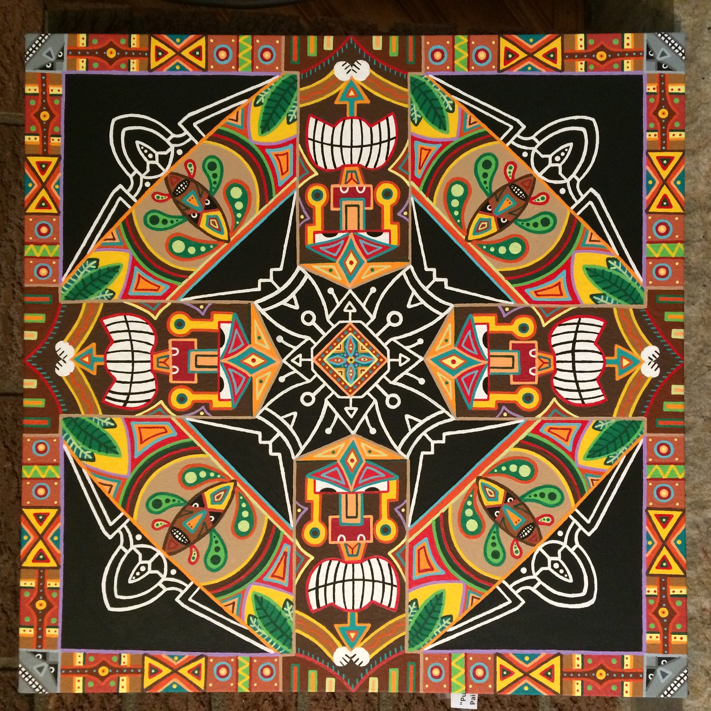 The next step in creating one of my Mandalas is to go over the outline again. The outline tightens up the design and adds contrast, almost like magic. Doing the outline is probably my favorite part, it feels like a meditation. I get in the zone. The brush gliding across the canvas, then dipping it to get more paint on my brush, becomes almost like a Qi Gong or Yoga movement - it just flows. I also started to add some of the details on the Tiki characters.