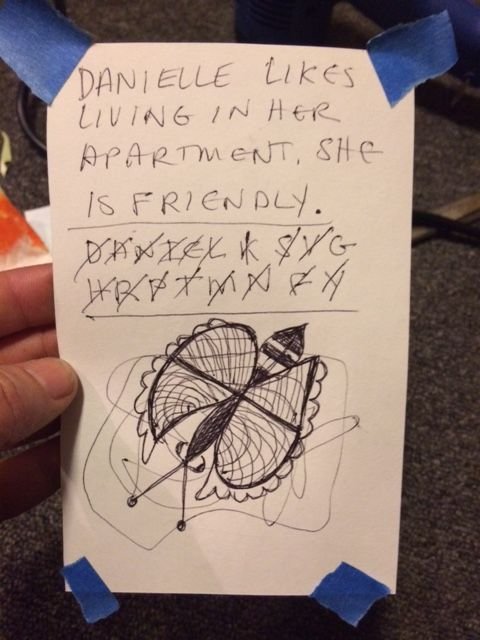 Here is a sigil i did for my neighbor, Danielle, who is a pretty crazy formerly homeless veteran, who moved in next door - it is a prayer that she feels comfortable in her home. I realized later, that I am violating her free will - in a way and this sigil has not exactly worked - but she is still here in the building, and it's been a long while - maybe 8 months, so probably a record for her - but you can see - i took the sentence, pulled the single letters out and made a design... hung it on the wall... I activated the sigil, simply by drawing it, and thinking about her... I decided to use it in this experiment because it was there - and I needed something else for the picture.