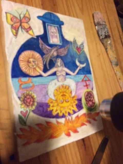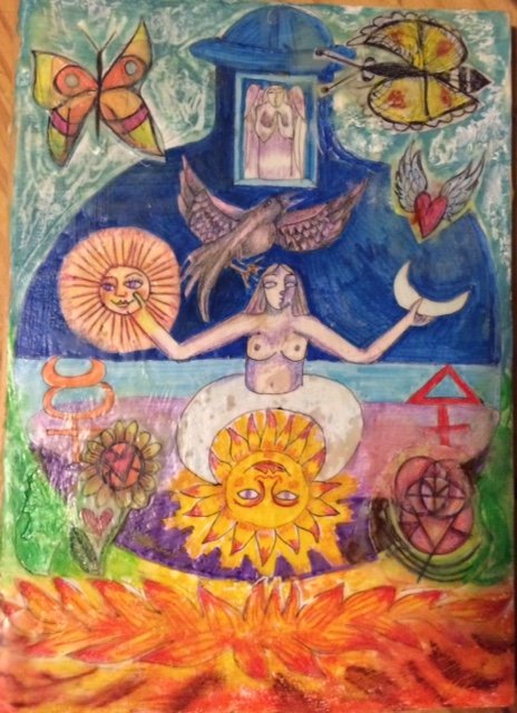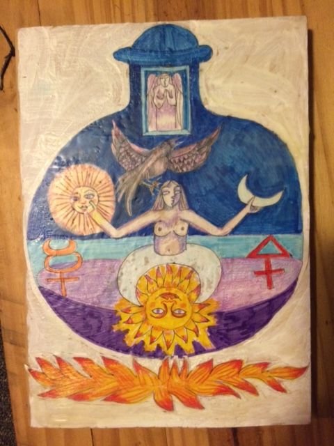 About 8 months ago, I had done this colored pencil, marker rendition of an alchemical image I saw in a book...and I had glued it to a piece of wood...