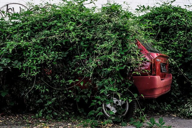 This photo is a much different vibe than the first two, but it had an appeal to me that I couldn't forget. I think it's how nature is utterly swallowing this vehicle up. Being that it's a relatively modern car, it really emphasizes how quickly it's being reclaimed. Though it's probably just some sort of ivy/vine growing over it.... that car would be disappeared in another year or two, by the looks of it. I'm always one to root for team Mother Nature!