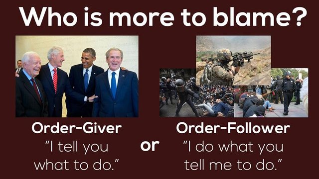 Both share blame, guilt, fault and culpability in the creation of wrongs, harm, immorality and evil, but the order-followers are the ones who can choose to say "NO!" and stop doing what they re doing. They are ultimately the ones who bear the brunt of the responsibility of guilt, shame, blame, judgment, culpability and fault for the actions they themselves engaged in. Many of them take measures into their own hands, and use the authority passed down from the ruling order-givers. They are authorized to do as they do because they are the authorities.