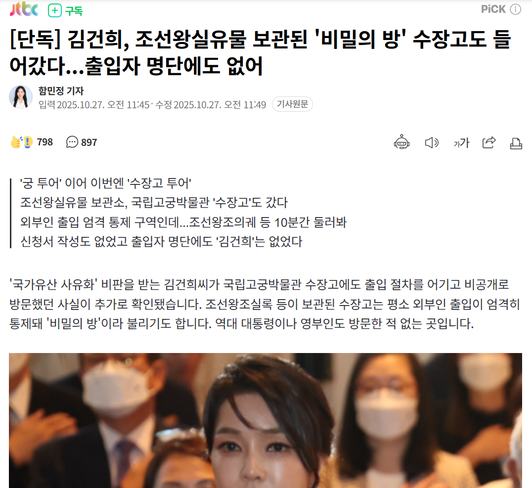 김씨가 국립고궁박물관 수장고를 본 이유를 확인해야 한다는 주장이 나옵니다. 2023년 3월 2일 뿐 아니라 그 사흘 뒤인 2023년 3월 5일에도 윤석열 전 대통령과 함께 와 "수장고를 보겠다"고 했기 때문입니다. 이날 박물관 직원은 수장고 열쇠를 가지러 갔고, 그 사이 이들 부부는 경복궁으로 자리를 옮겨 결과적으로 수장고에 들어가지는 않았습니다. 국립고궁박물관 측은 '김씨가 소장품을 빌리거나 소유하고 싶다는 취지의 발언을 한 적 있는지'에 대해서는 "해당 사항 없다"고 선을 그었습니다.