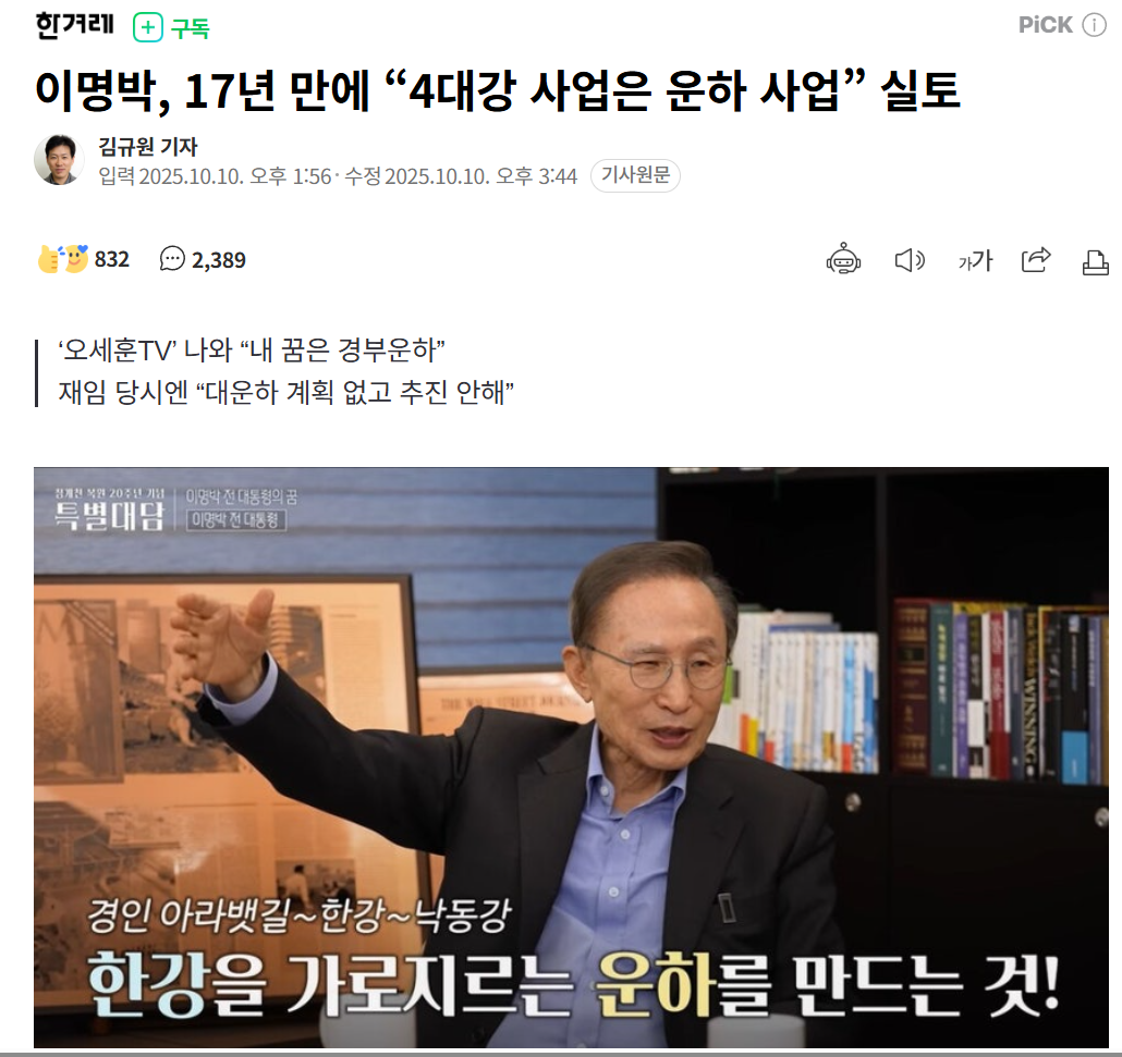 이명박 전 대통령이 ‘4대강 사업이 운하 (전 단계) 사업’이라는 사실을 이 사업을 추진한 지 17년 만에 스스로 실토했다. 그는 “다음 대통령이 한강과 낙동강을 연결하는 큰 꿈을 이뤘으면 좋겠다”고 밝혔다. 그는 4대강 사업의 모델이 서울 한강의 신곡보와 잠실보라는 점도 밝혔다.